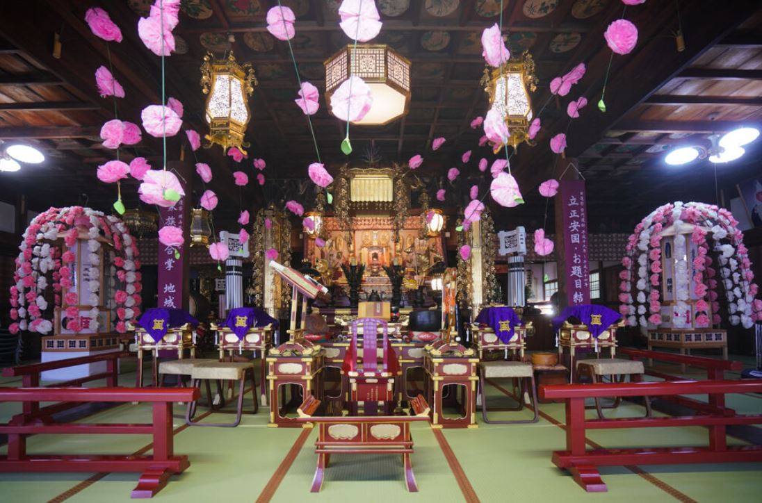 自坊ではご覧のように檀信徒による菊の奉納があったり、本堂内も万燈が飾られ、賑やかに行われます。法要後は法話が行われ、コロナの間はありませんが、食事の接待が行われます。