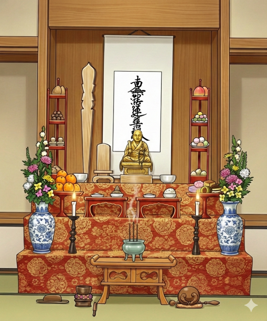 ①祭壇・・・飾り方は以前お配りした「追善のしおり」をご覧ください。