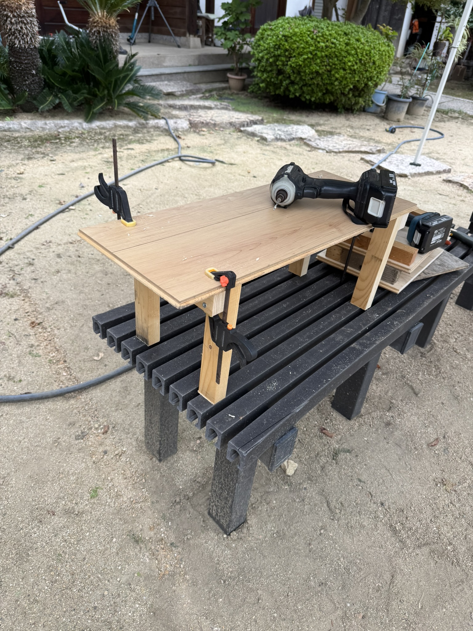 また、大菊の場合、複数の鉢を高さを揃えて並べるので、高さを調整するための5~10cm程度の低い台も必要です。これは適当な板に角材の端材を付けるだけなので簡単です。