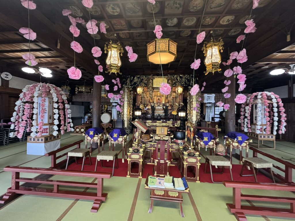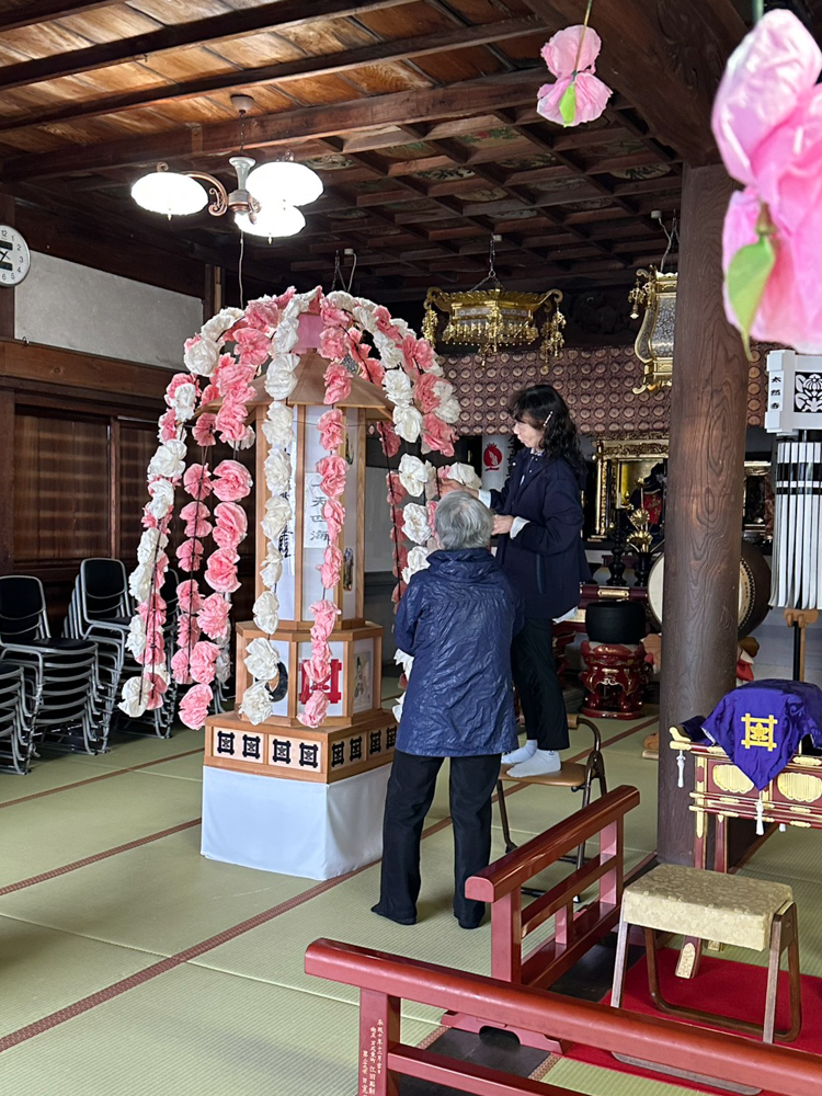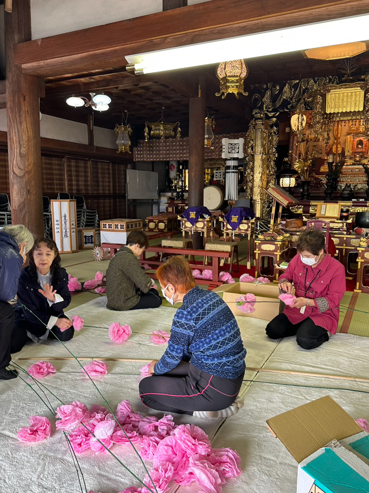 2日、青年会の女性陣が本堂の飾り付けを行いました。
