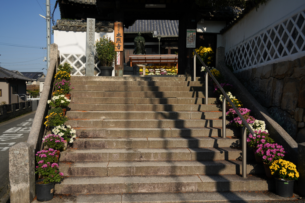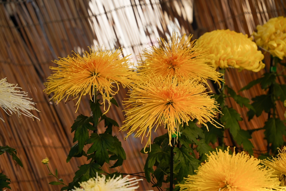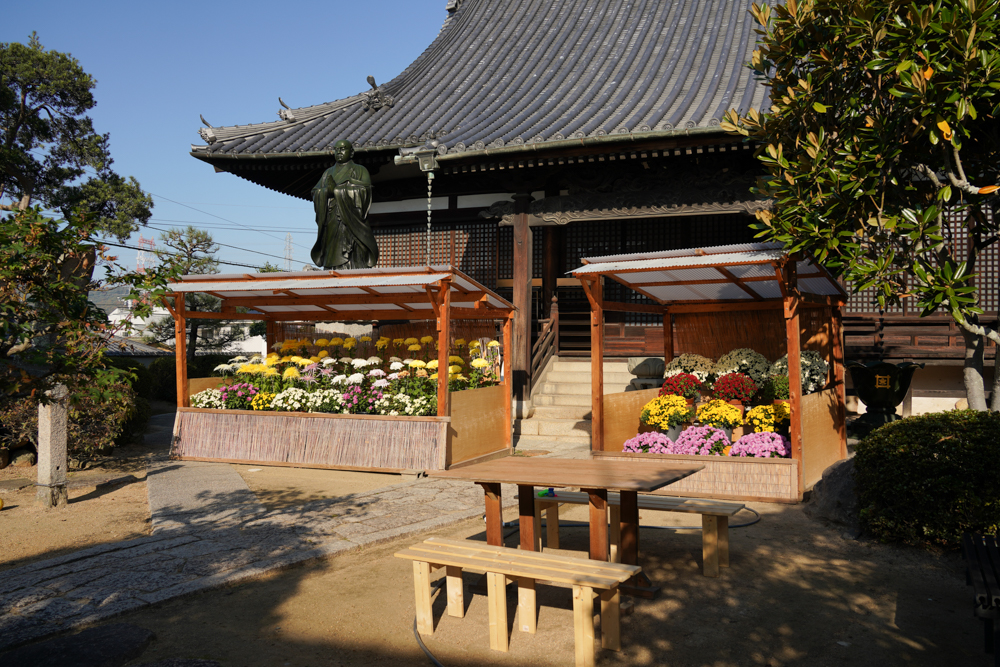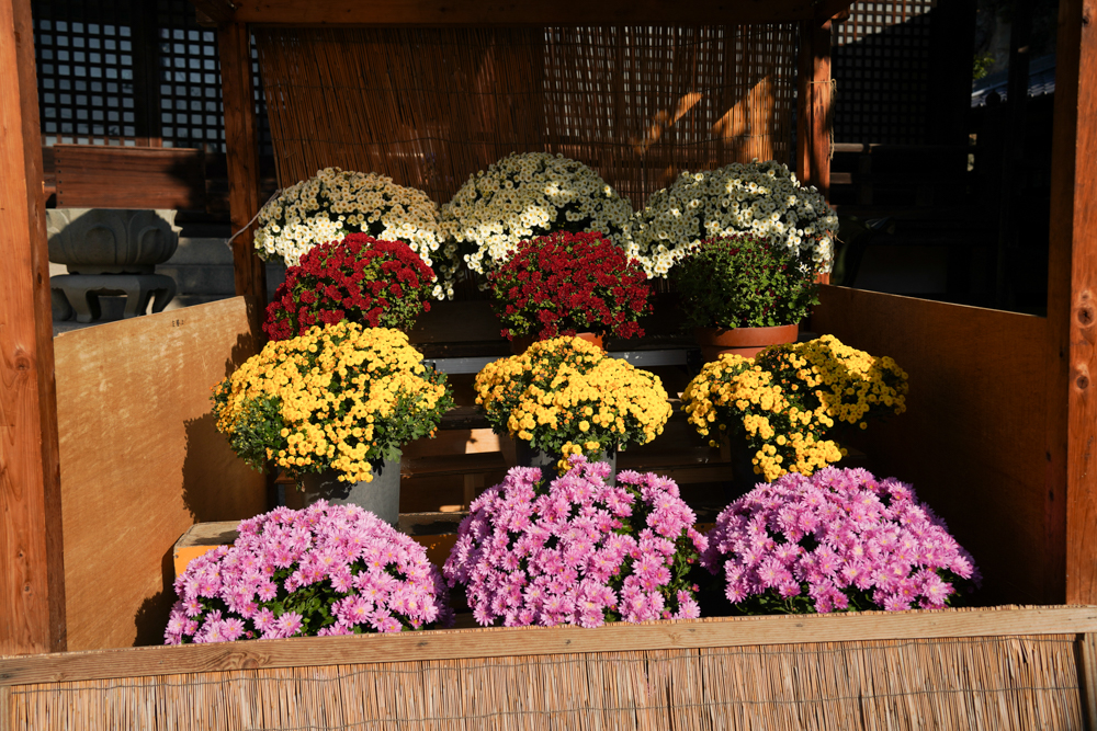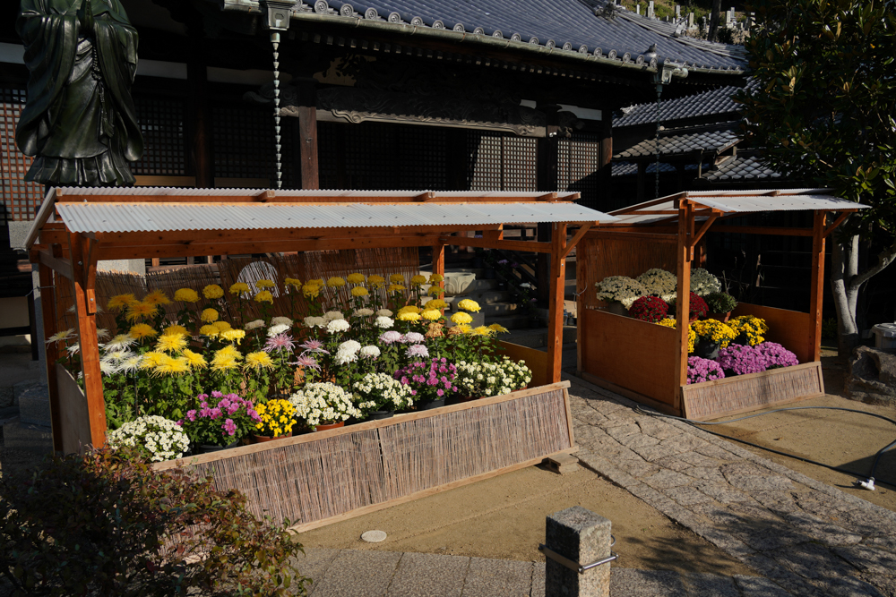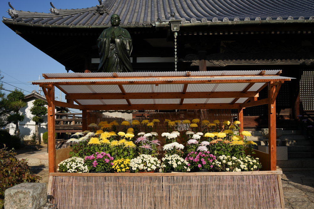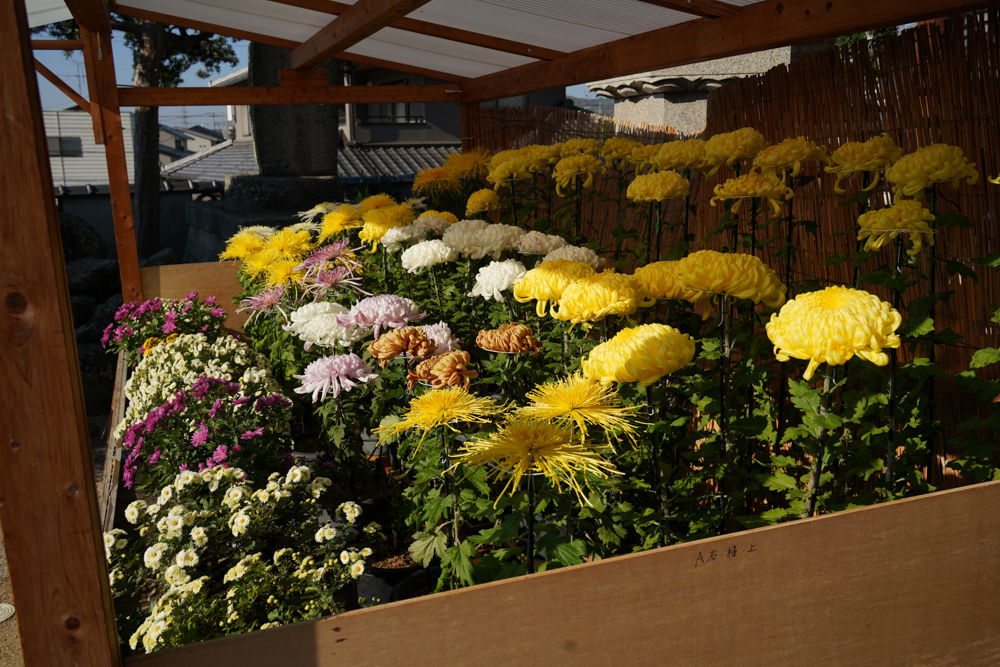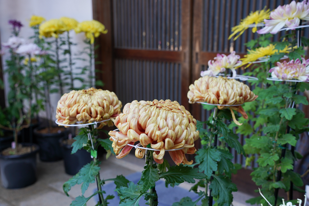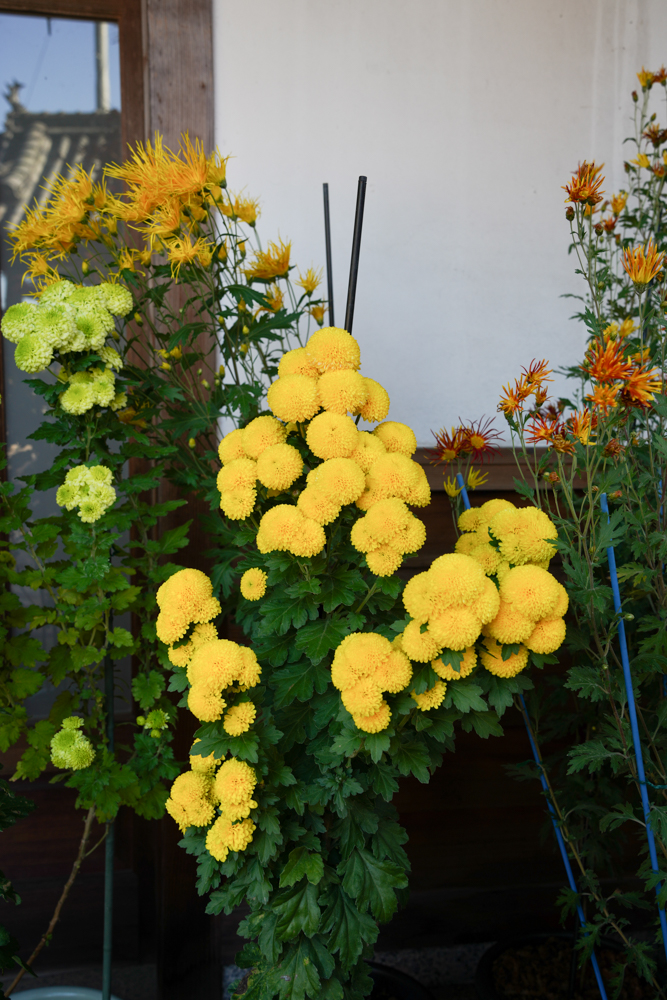 菊の状況 境内の花々・樹木 2025.11.19 お会式は済んだのですが、今年は開花が遅かったせいか、見頃を迎えています。ご自由にご覧ください。 私の育てた菊も、他の菊に見劣りすること無く立派に咲いています。さすがに約半年間お世話をしましたから愛着が湧きますね。