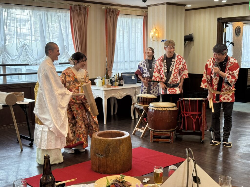 披露宴ではマグロの入刀(ケーキ入刀の代わり)、マグロの解体ショー、餅つきパフォーマンス、総代さんの歌等があり、楽しめました。