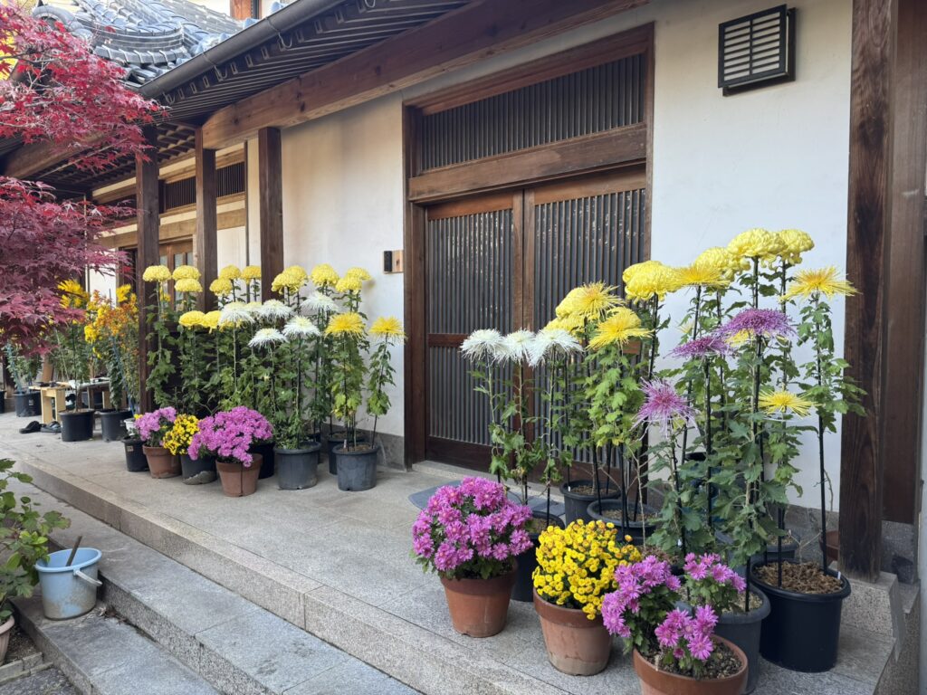 菊の小屋を解体し、小菊は各自持って帰っていただき、まだ見頃な大菊は玄関前に移動させました。まだ半月くらいは見られそうです。