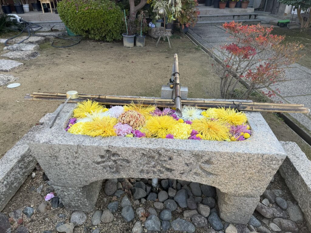 花は、ご覧のように手水鉢水を張って浮かしてやりました。ちょっと入れすぎですが、なかなか綺麗です。