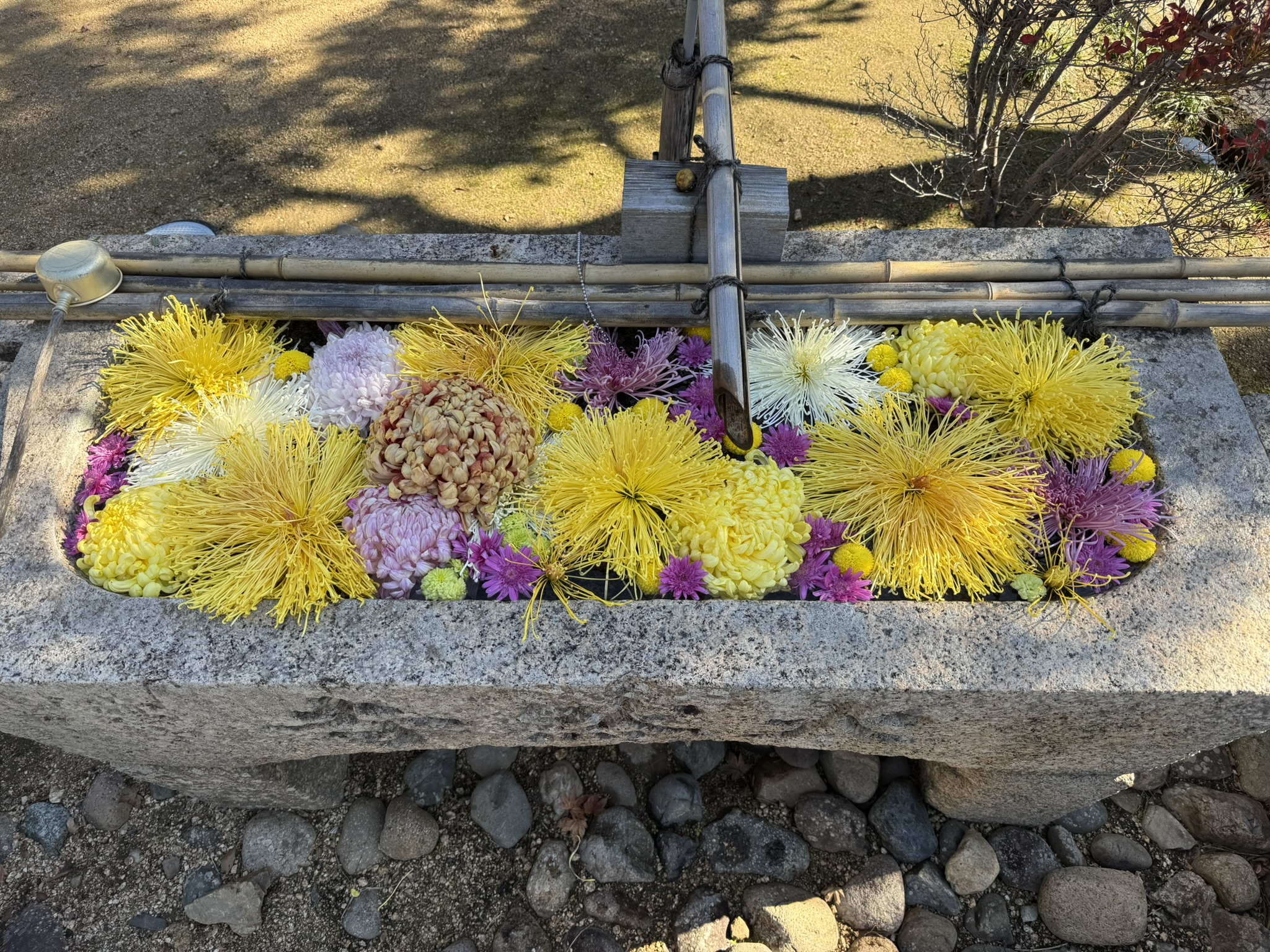 花は、ご覧のように手水鉢水を張って浮かしてやりました。ちょっと入れすぎですが、なかなか綺麗です。