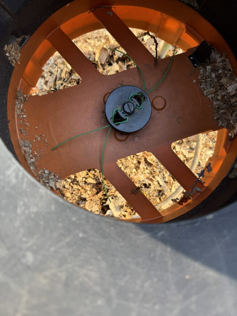 しくみは、ナイロンコードの草刈り機と同じで、ナイロンコードが高速回転して落ち葉を粉砕します。少々の小枝も粉砕しますが、ナイロンコードがすぐに短くなります。