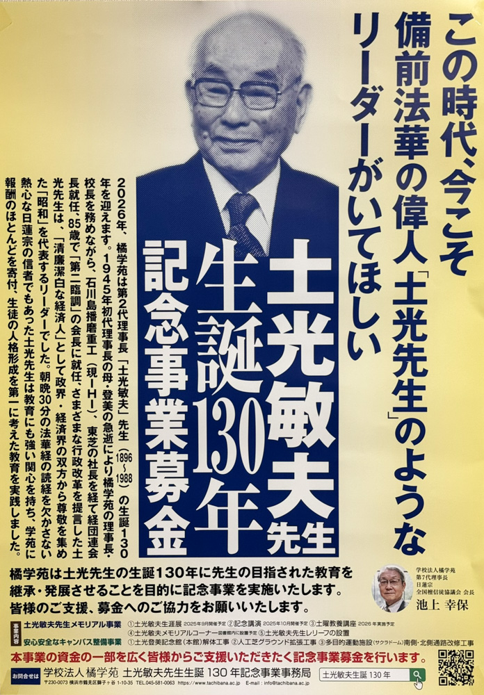 土光さんのお母さんは法華経の信仰が大変篤く、その精神を教育に生かそうと、横浜鶴見に「橘学苑」という学校を創立しました。その後、お母さんの意志を継ぎ、敏夫さんが理事長・校長に就任し、自ら講師として生徒たちに人生哲学を説いたといいます。
