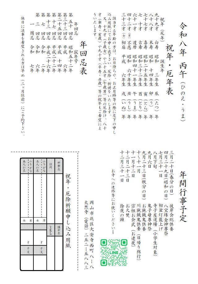 該当する年齢の方は、お日待ちや、お正月経等の際に左下の申し込み用紙にてお申し出下さい。厄除・祝祷をいたします。又、十九才(子歳女)や二十五才(午歳男)等の厄除け、八十才(傘寿・亥歳)や九十才(卒寿・丑歳)等の祝年もご希望によりいたします。