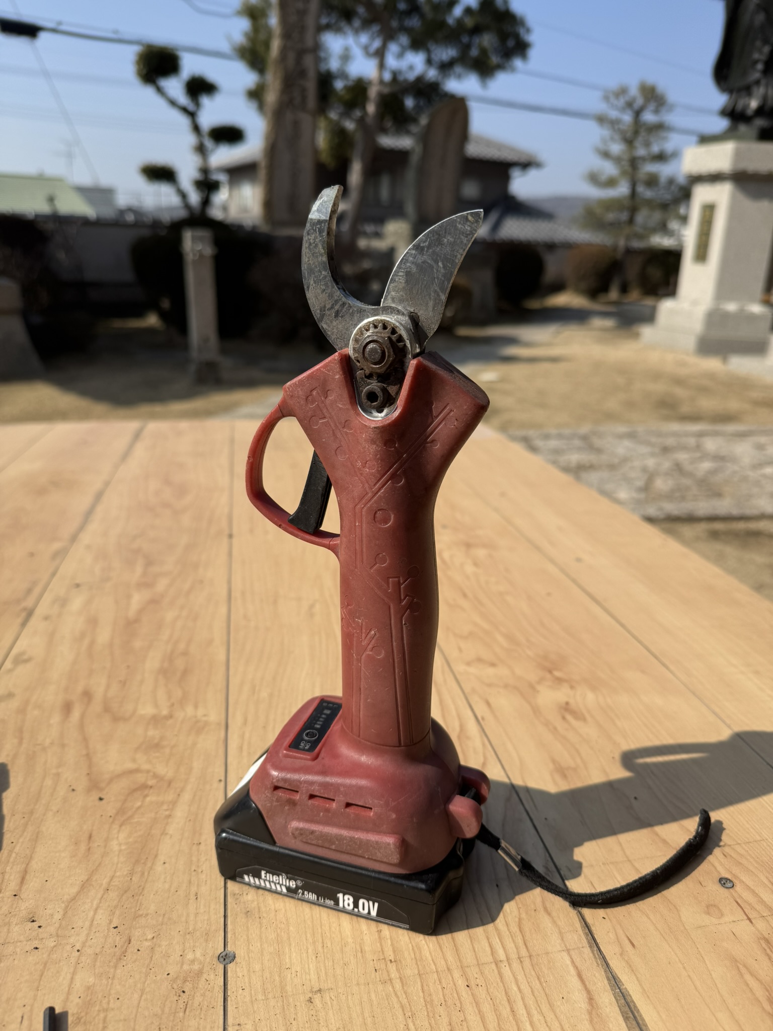 この電動バサミ、5年前にAmazonで適当に買った中国製ですが、よく働いてくれます。3cm位の細枝も難なく切ってくれて最初は感動ものでした。特に伐採した樹木の小枝を小さくする時には大活躍です。