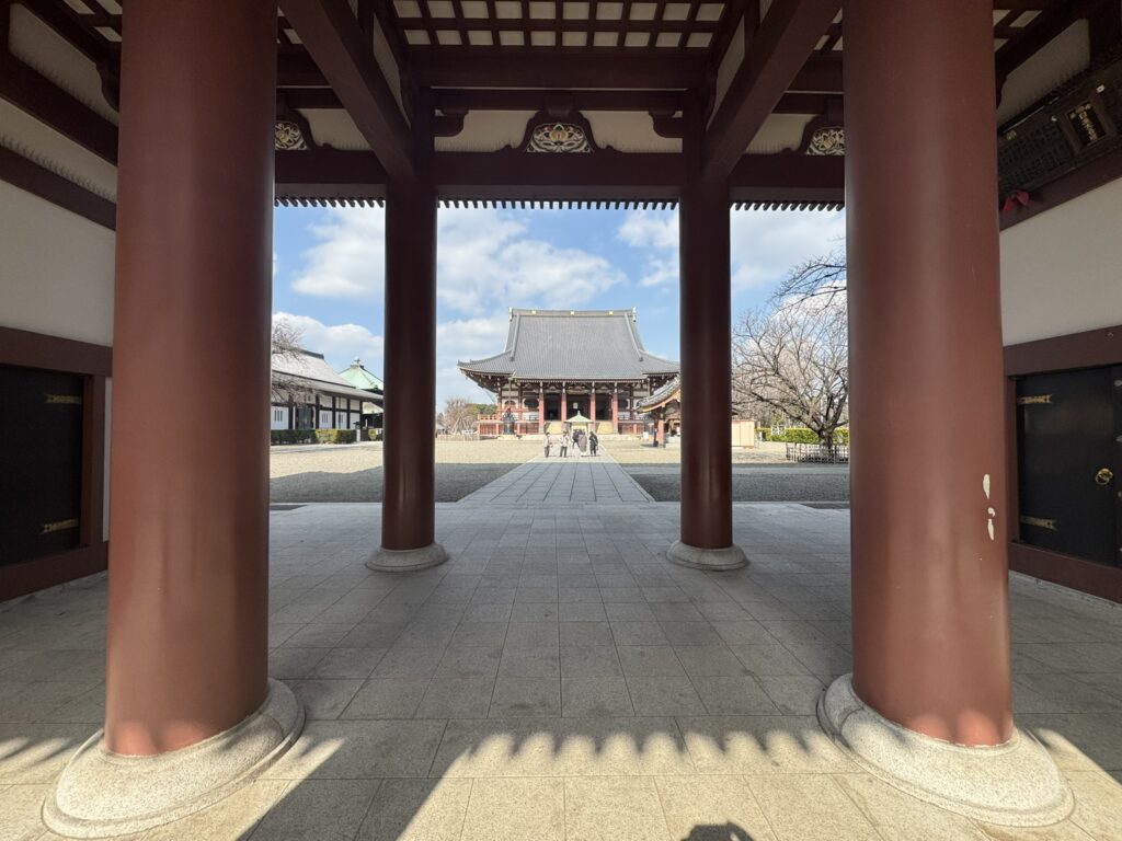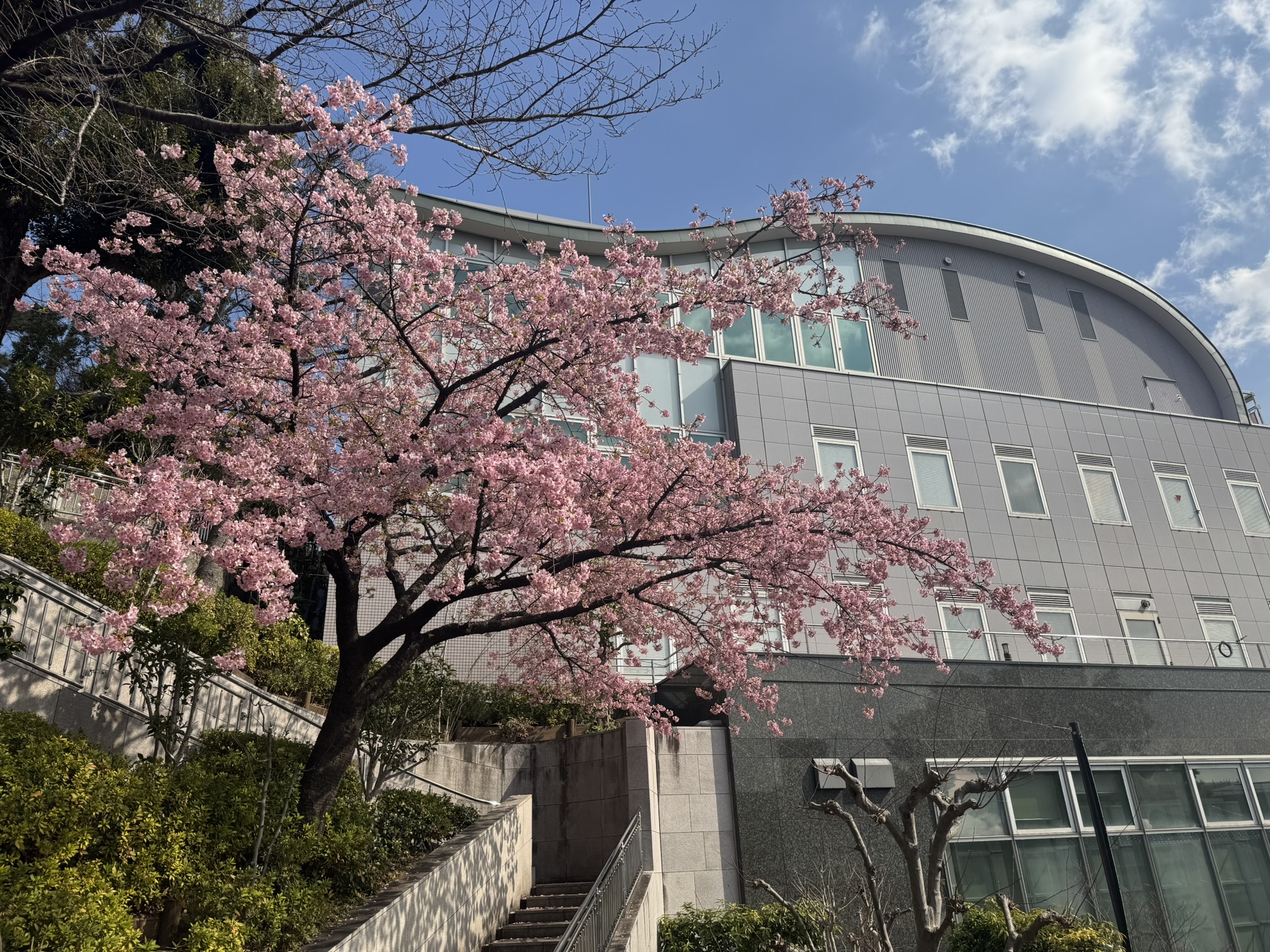 此経難持坂の石階段の横の河津桜が満開でした。後ろの建物が宗務院(日蓮宗本部)です。