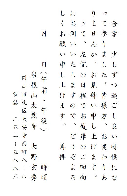 お彼岸経の案内 法務・行事・仏事 2026.03.07 今年も早3月、お彼岸が近づいてきました。先日、お彼岸経の案内の葉書を出させていただきました。お彼岸のお経は、講中外を中心に回ります。二人でまいるので、お彼岸の期間中には回れそうです。