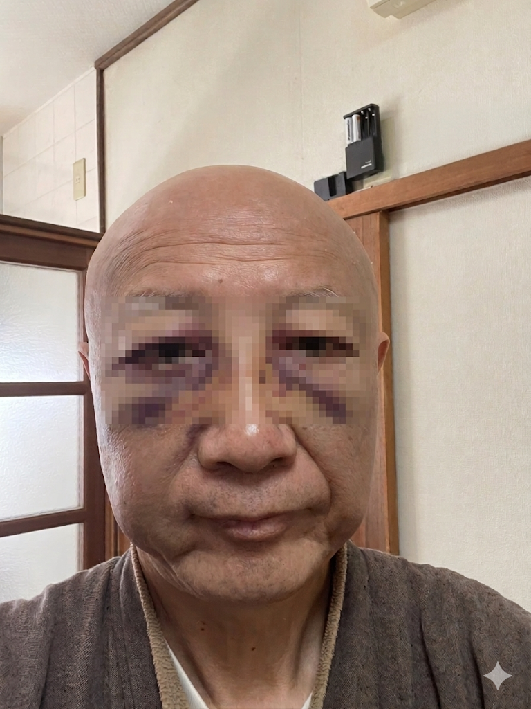 そして、翌日にかけて顔面が腫れ上がり、目の下が赤紫に変色し、悲惨な顔になってしまいました。・・・写真には若干モザイク掛けています。あまりにも見苦しいので。