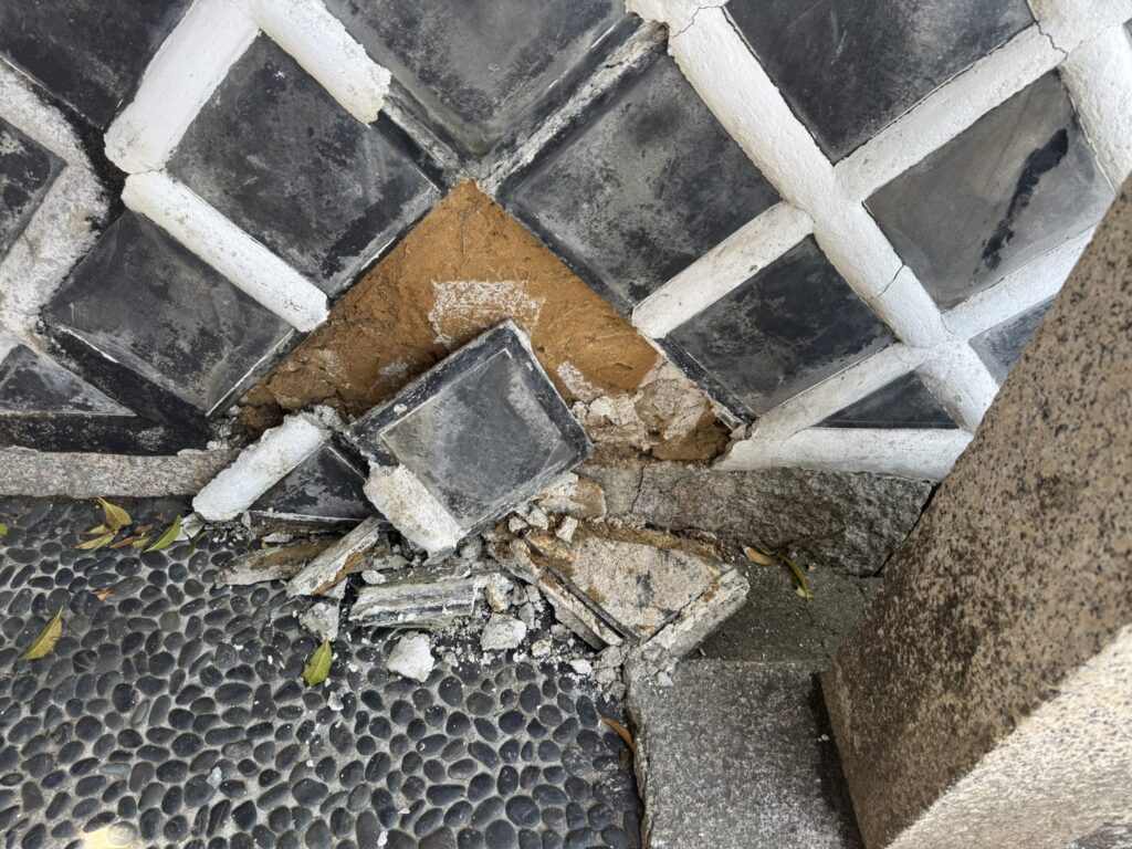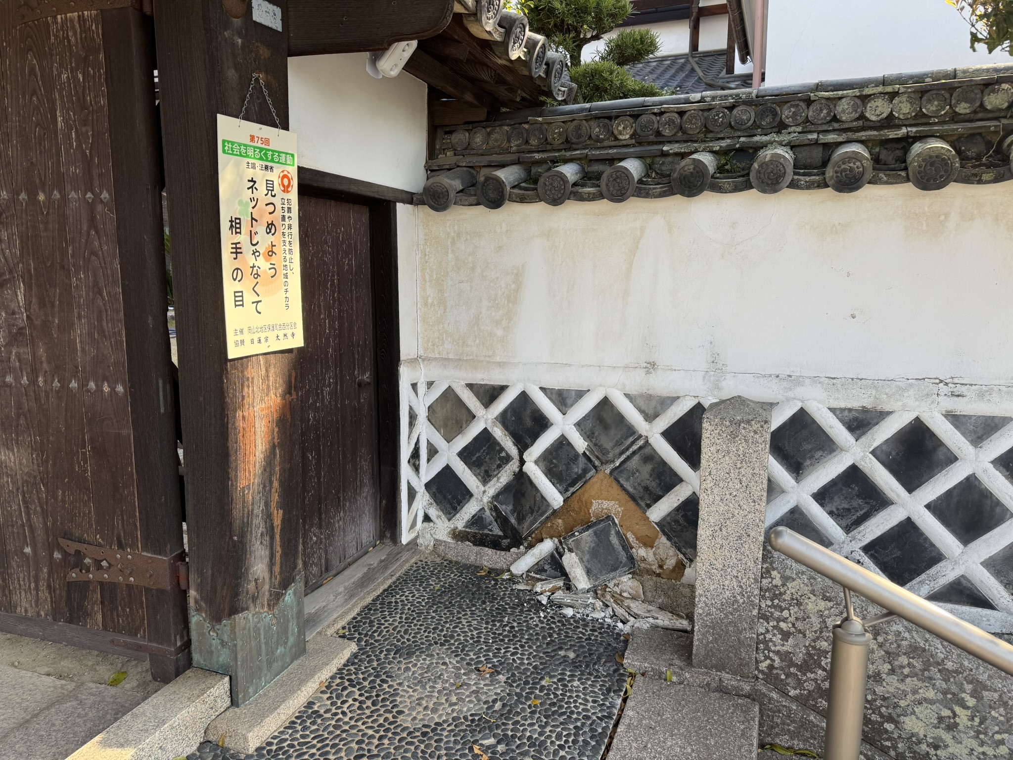 山門横の白壁が・・・ 境内・伽藍 2026.04.03 山門、右横の白壁が一箇所、剥がれて落ちてしまいました。ここのところの雨と強風のせいでしょうか。目立つところなので、早急に直さなくては。このような白壁は趣があっていいのですが、維持管理が大変です。