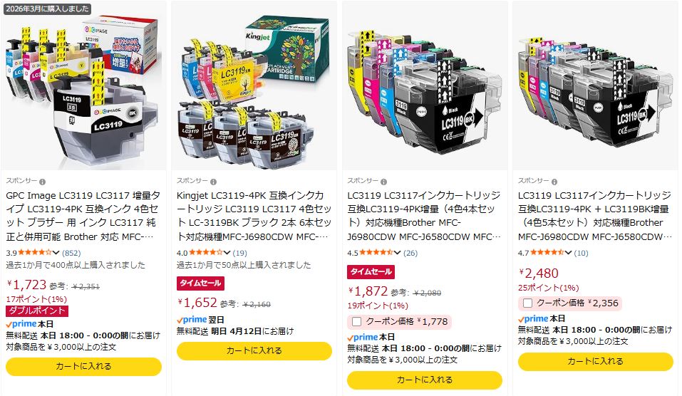 そこで気になってくるのが互換インクです。4色パック純正品が1万円を超えるのに対し、互換インクなら2000円以下とかなり安く買えます。