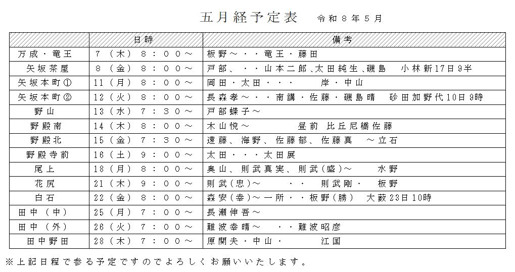 五月経の日程 法務・行事・仏事 2026.04.25 五月経の日程ができました。連休明けの7日より回りますので、よろしくお願いします。「正月・五月・九月」は正五九(しょうごく)とも呼ばれ、祈祷月(きとうづき)とされています。日本の伝統的な信仰や暦において、この3つの月が季節の節目であり、災厄が入りやすい時期と考えられてきたためです。自坊では九月経は行いませんが、行っているお寺もあります。